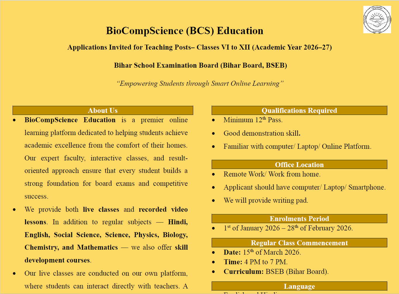 BioCompScience Education encourages qualified teachers with expertise in technical subjects to apply for these positions by filling out the registration form provided in the vacancy section.
