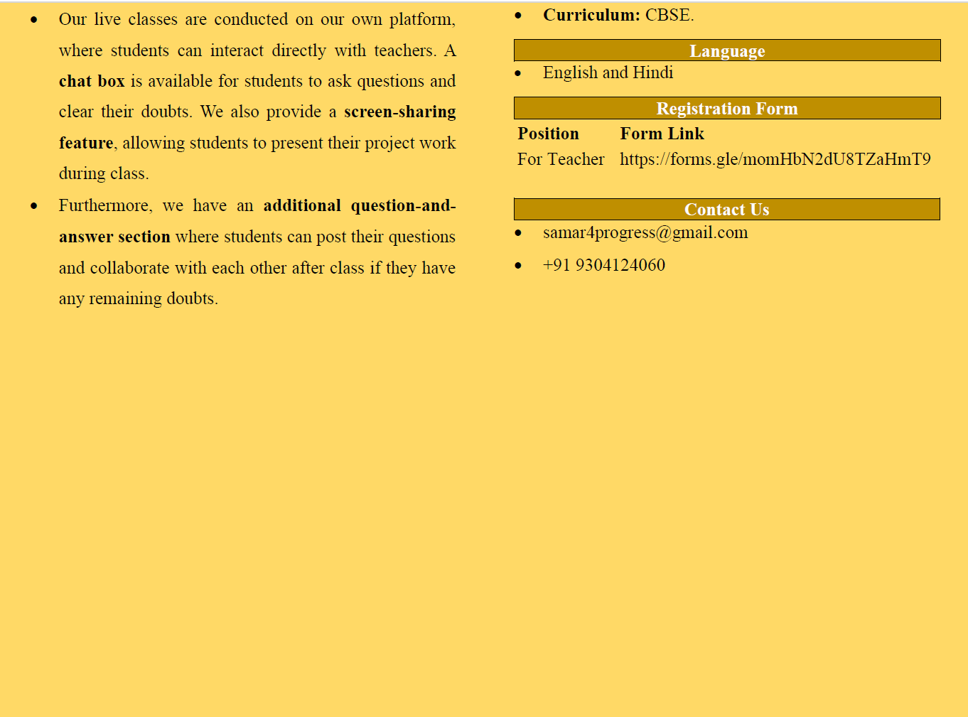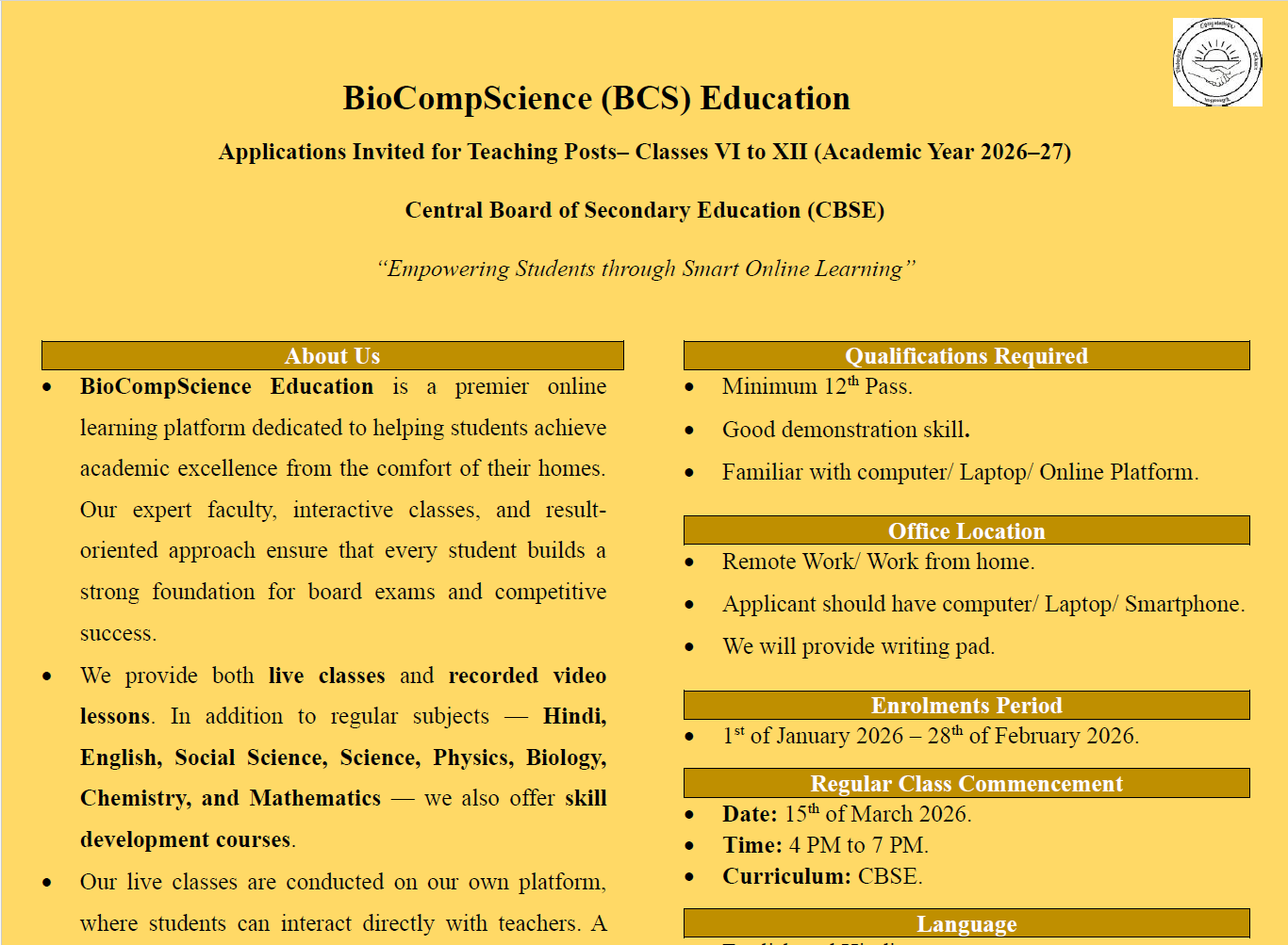 BioCompScience Education encourages qualified teachers with expertise in technical subjects to apply for these positions by filling out the registration form provided in the vacancy section.